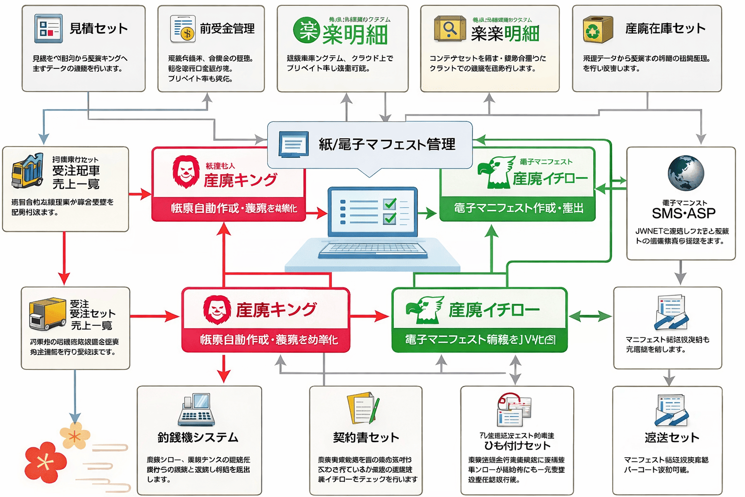 SMS産廃ソフトは、処理業者・排出事業者それぞれの目的に合わせて、必要なものを必要な順番で導入できる設計が特長です。