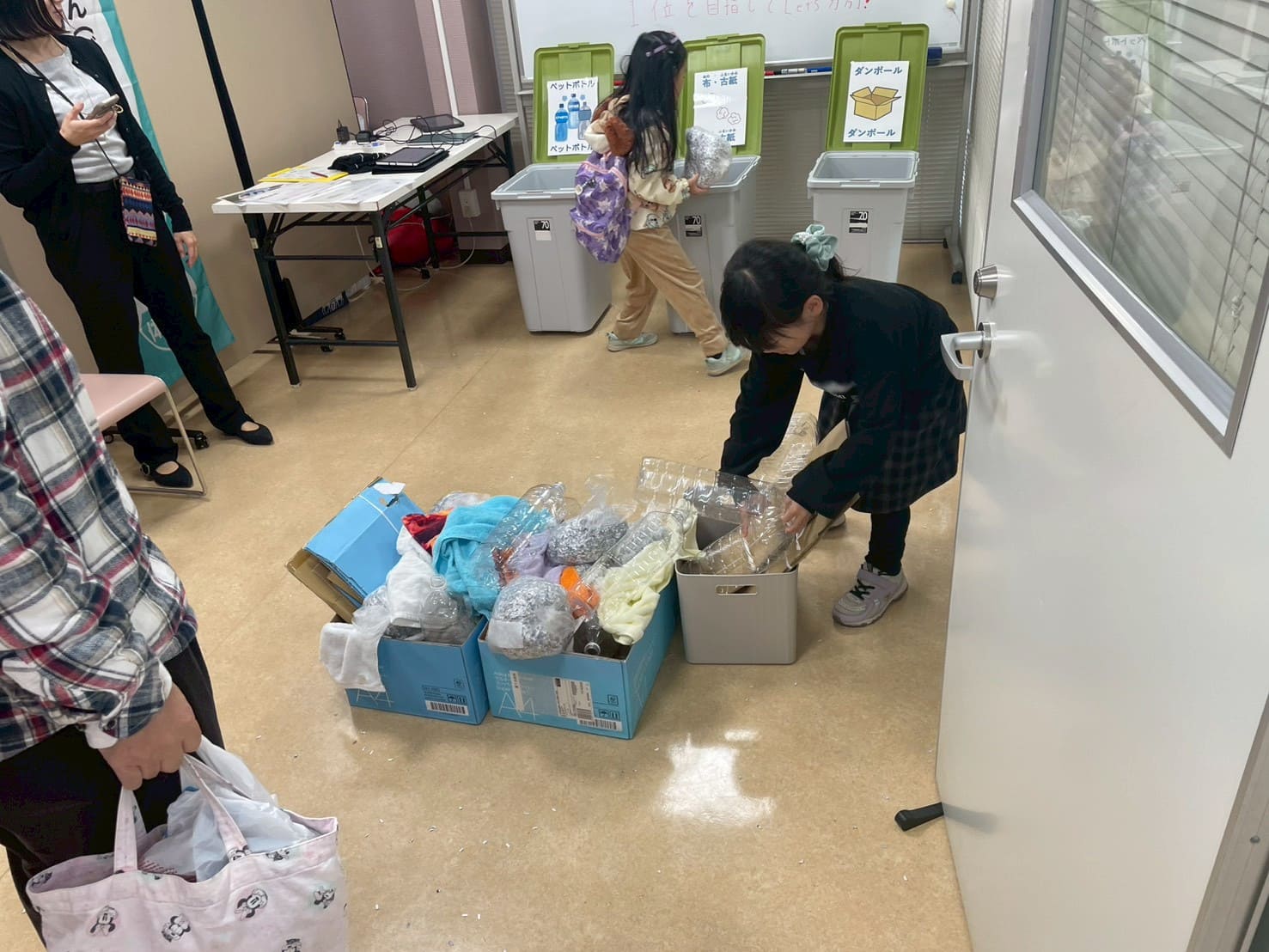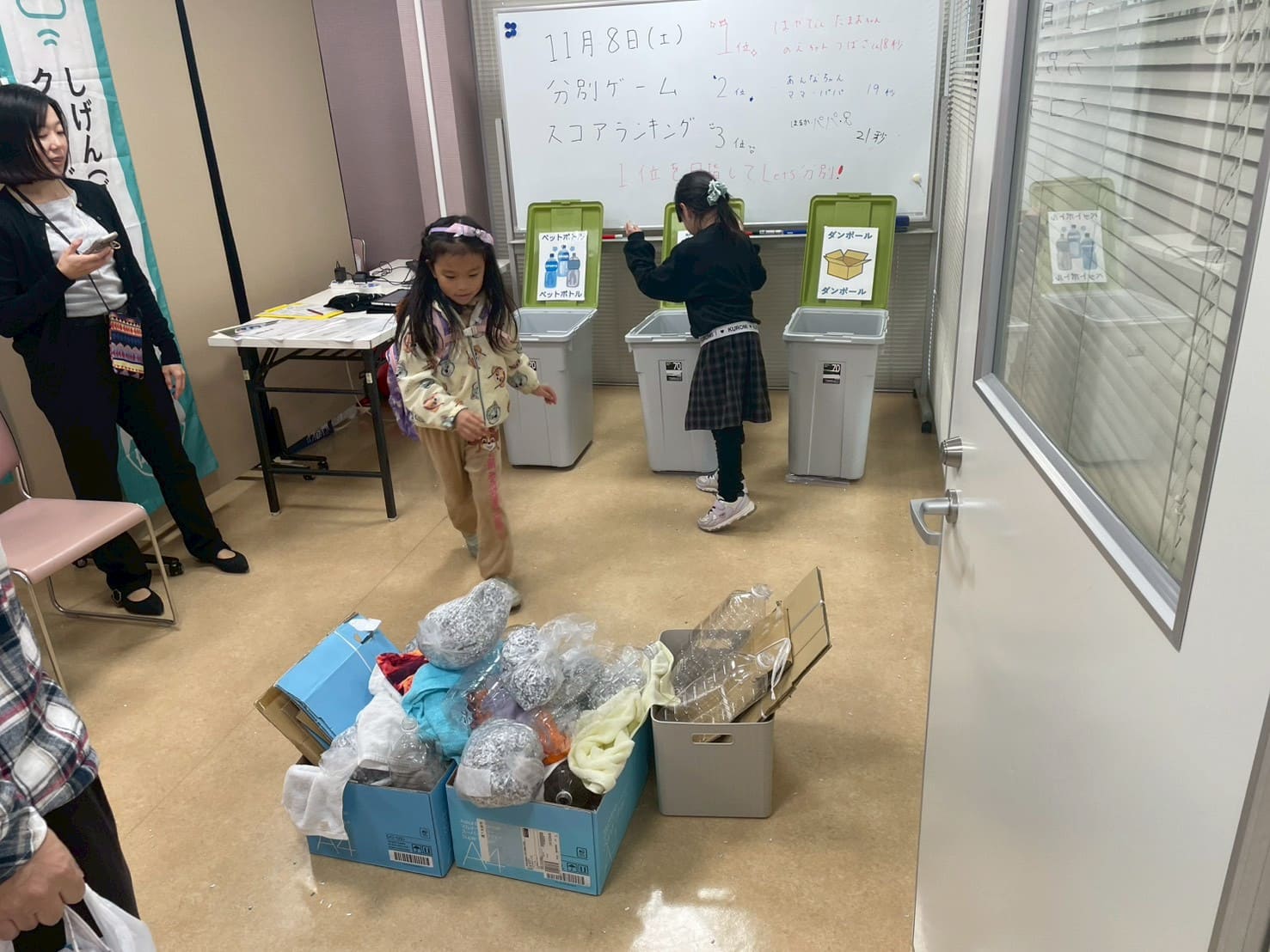 参加者は1分間で3つの箱(例:ペットボトル/古紙・布/段ボール古紙)に分別。終わったらその場で重量・指標を確認できるしくみで、親子で楽しくリサイクル理解を深めることがねらいです。